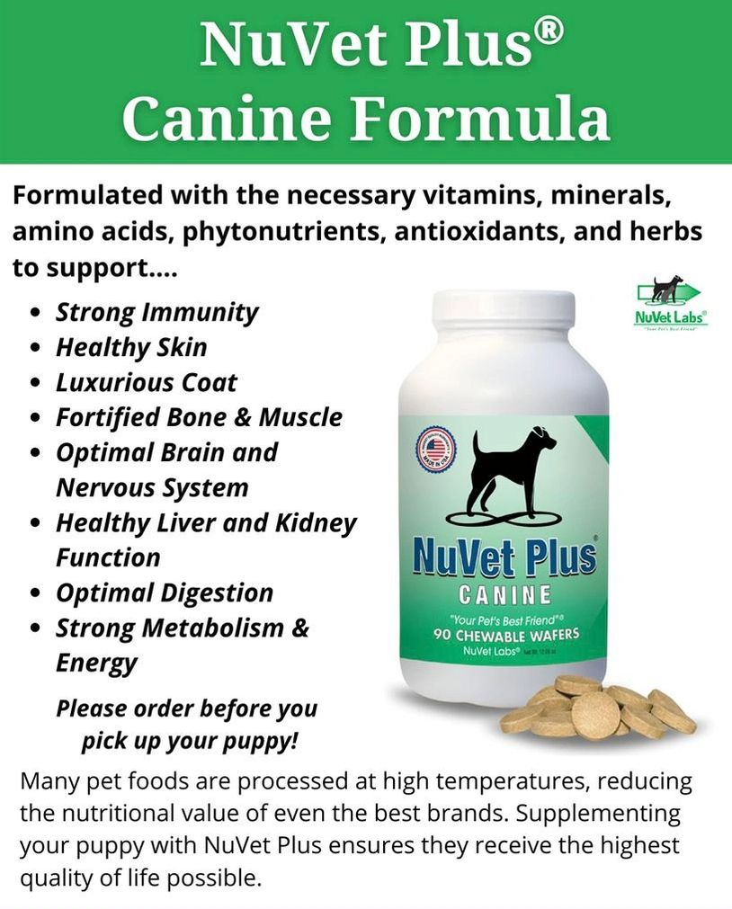Though not required! We do highly recommend keeping your puppy on the NuVet supplements they have already been started on since they starting eating food. These can help boost you puppy’s immune system along with helping them live a longer healthier life. Please at least give it a try to see the results yourself It is satisfaction guaranteed.